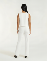 O caimento fluido do tecido proporciona um movimento leve e gracioso, enquanto a cintura alta da calça alonga a silhueta. É um conjunto versátil que funciona como um "look pronto", mas também permite infinitas combinações usando as peças separadamente.