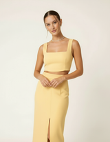 Modelo: Conjunto de duas peças (Top Cropped Estruturado + Saia Midi).