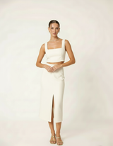 O top apresenta um decote quadrado clássico que valoriza o colo de forma discreta, enquanto o comprimento cropped na medida certa encontra o cós alto da saia, criando uma silhueta harmônica e alongada. A saia, com sua fenda frontal estratégica, adiciona movimento e um toque sutil de sensualidade ao caminhar, quebrando a seriedade do comprimento midi. É a escolha perfeita para eventos diurnos sofisticados, brunchs ou jantares ao pôr do sol.
